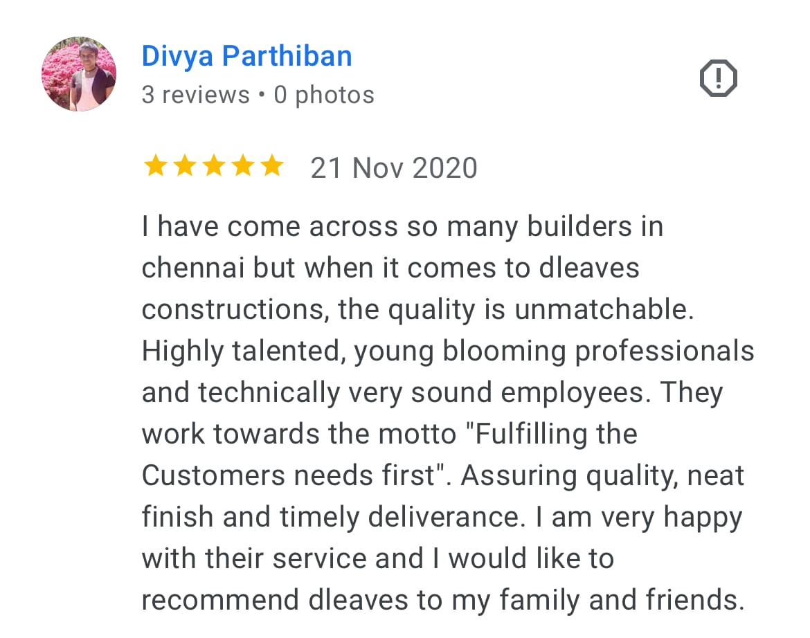 At D Leaves Construction, we're more than just home builders in Chennai; we're dream weavers, turning your vision into stunning realities. Whether you're dreaming of a luxurious apartment, a cozy individual house, or a grand residential masterpiece, we're here to bring your aspirations to life with our expertise and passion.